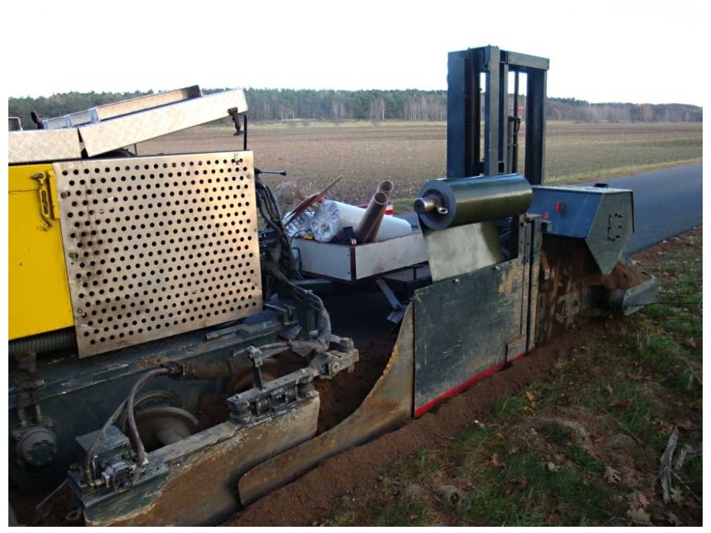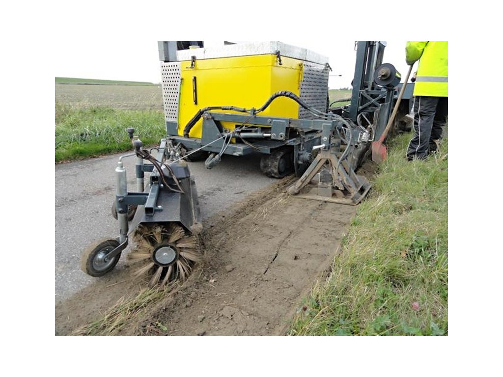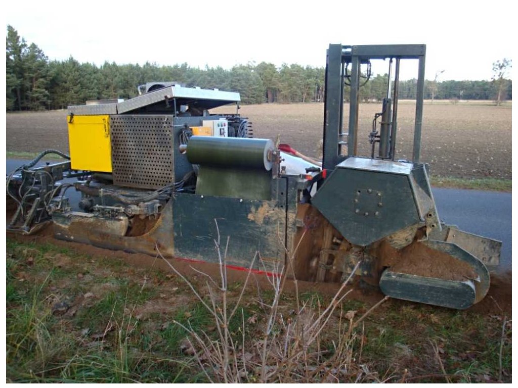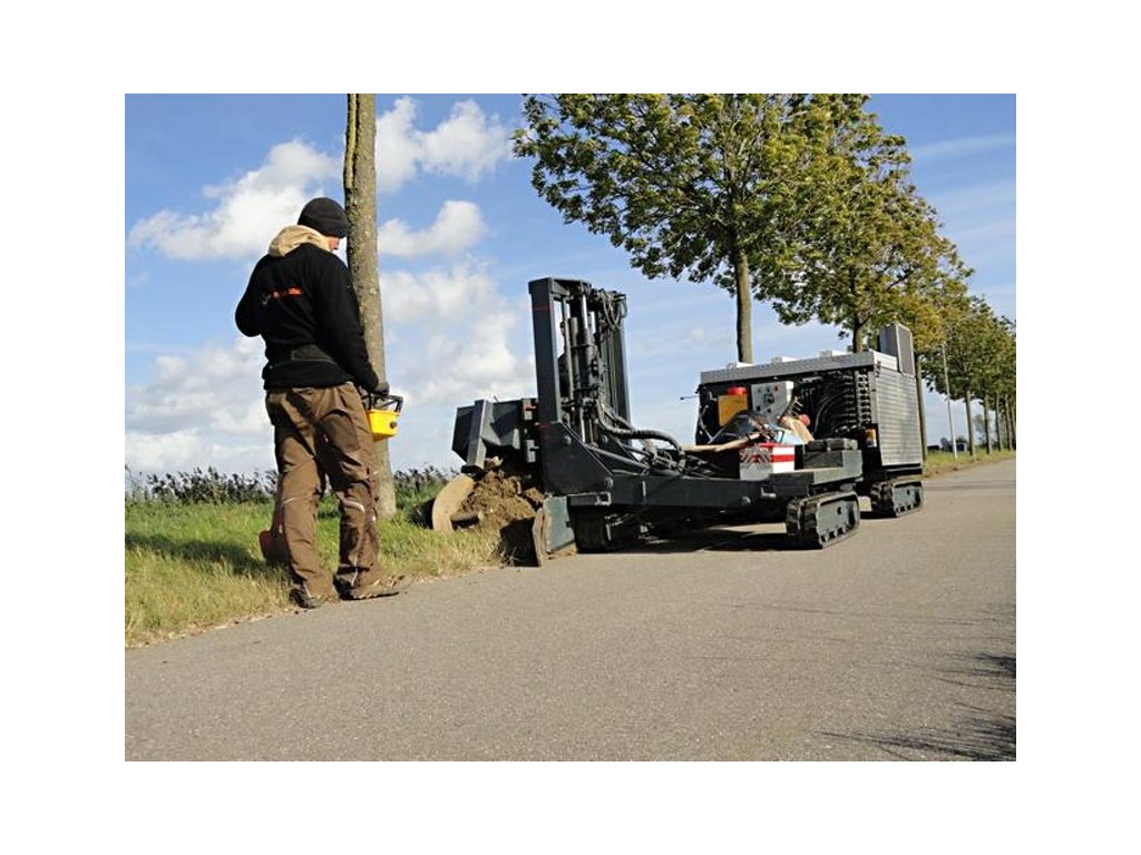 Princip: Řetězové řezací zařízení vytváří v zemi přibližně 10 cm široký zářez. Kořeny v této oblasti jsou přeřezány. Bezprostředně po tomto procesu se do úzkého zářezu umístí kořenová bariéra. Stroj zajistí, že bude kořenová ochrana umístěna do správné hloubky. Po umístění kořenové bariéry se provede zpětný zásyp, který zajistí, že kořenová bariéra zůstane na stejném místě. V posledním kroku pěch zhutní půdu u kořenové bariérya zamete komunikaci.